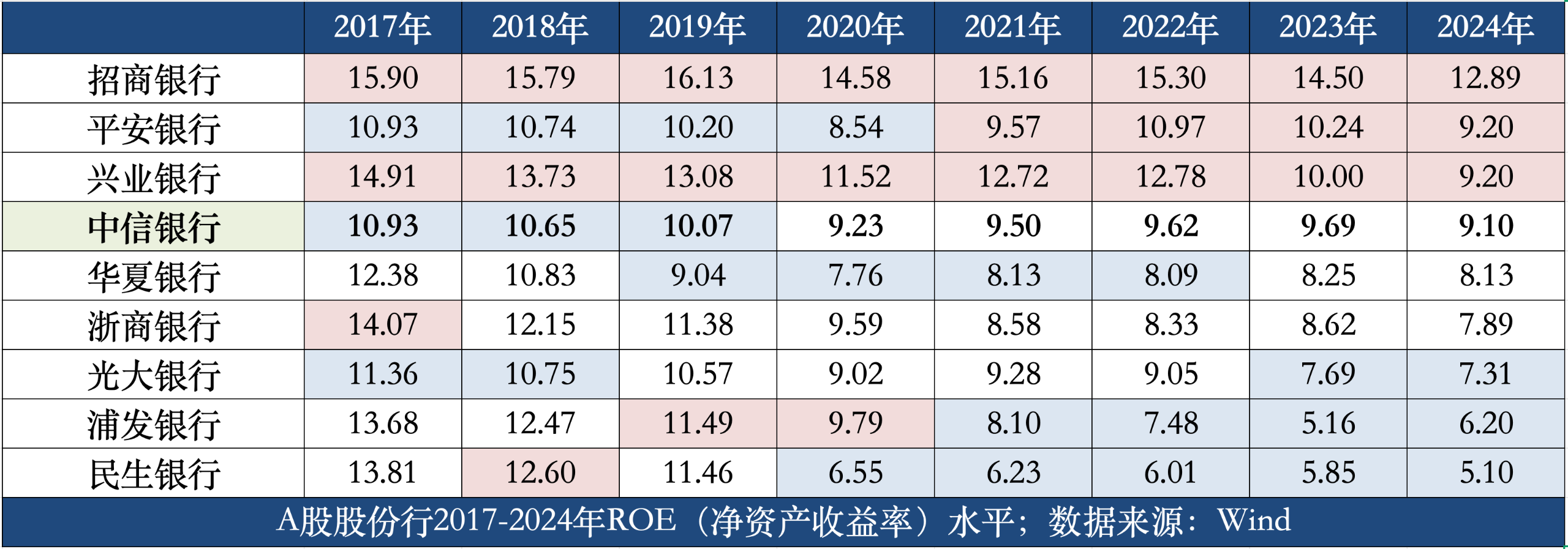信风测算发现,中信银行的总资产虽常年处于股份行中上游水平,但2012-2019年的ROE(净资产收益率)水平常年处于股份行末位(倒数1-3名),呈现出“大而重”的形态。