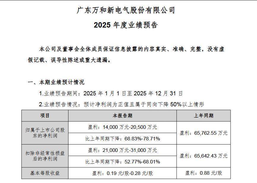 1月30日晚间国内炒股软件排名,万和电气(002543)发布业绩预告,预计公司2025年度归母净利润为1.4亿元至2.05亿元,较上年同期的6.58亿元下降68.83%-78.71%。