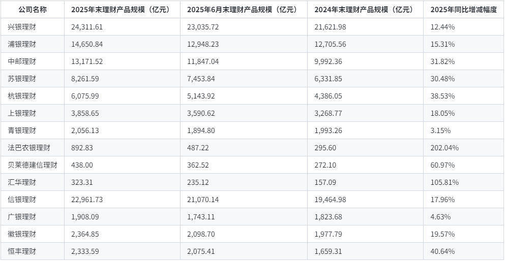 目前已经有14家理财公司披露2025年下半年理财业务报告,包括兴银理财、浦银理财、中邮理财、信银理财、徽银理财、杭银理财、青银理财、汇华理财、贝莱德建信理财、法巴农银理财等。