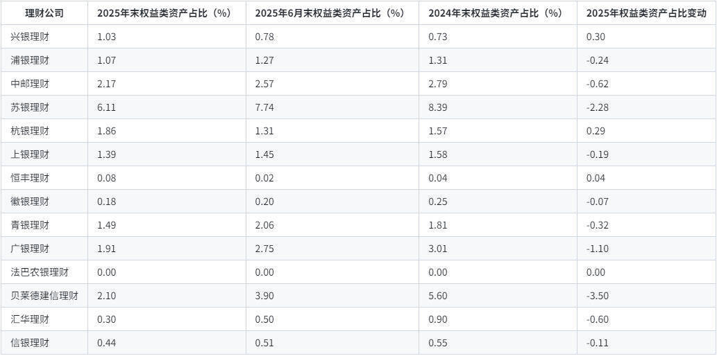 14家理财公司2025年权益类资产投资比例及变动幅度一览