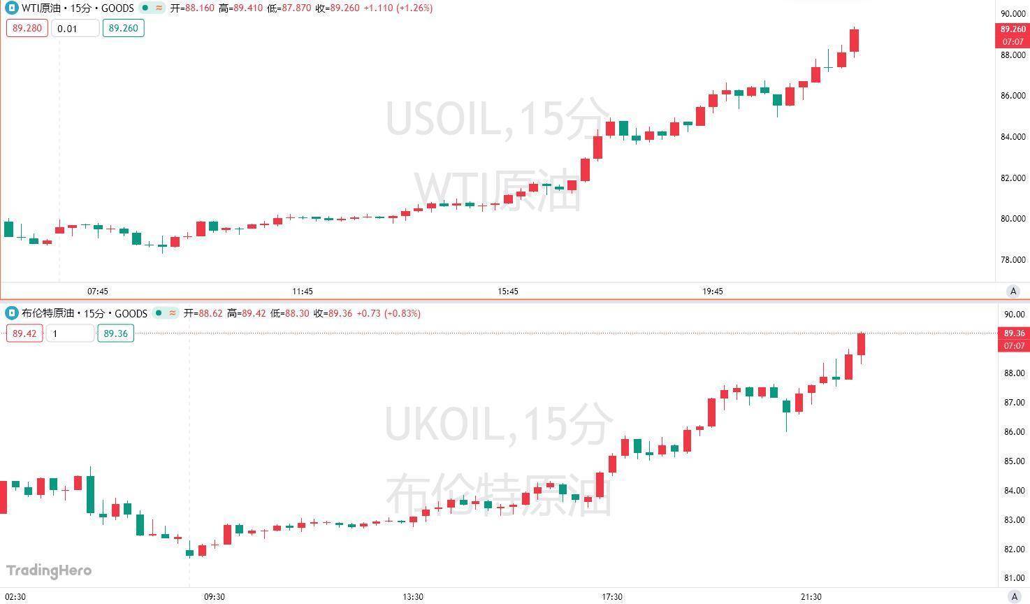 自冲突开始以来,油价已大幅跳涨,周五,全球基准布伦特原油的交易价格逼近90美元,远高于上周的约72美元;WTI原油日内更是大涨13%,同样逼近90美元。如果未来几天有更多油田被迫停产,这可能会引发价格的新一轮上涨,一些分析师预计布伦特原油将突破每桶100美元的关口。