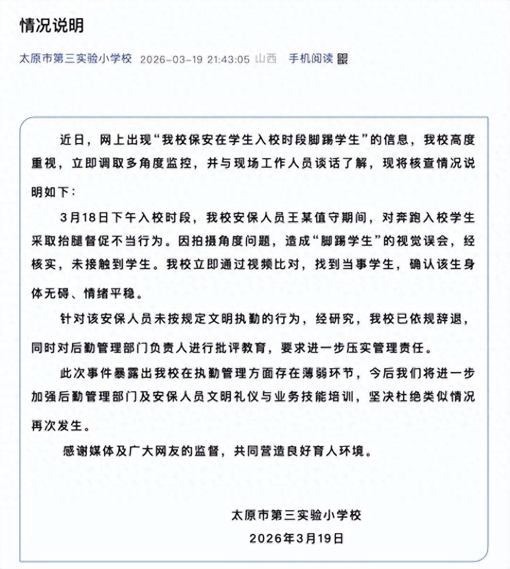 太原市第三实验小学校3月19日发布情况说明:近日,网上出现“我校保安在学生入校时段脚踢学生”的信息,我校高度重视,立即调取多角度监控,并与现场工作人员谈话了解,现将核查情况说明如下: