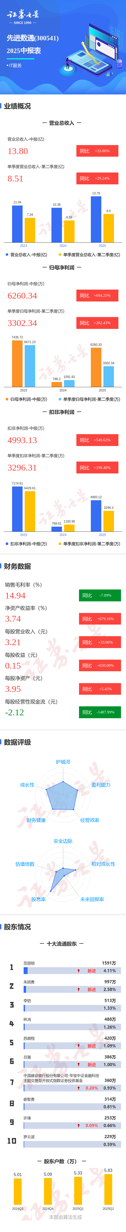 证券之星消息,先进数通2025年中报显示,公司主营收入13.8亿元,同比上升33.06%;归母净利润6260.34万元,同比上升694.25%;扣非净利润4993.13万元,同比上升549.62%;其中2025年第二季度,公司单季度主营收入8.51亿元,同比上升29.24%;单季度归母净利润3302.34万元,同比上升202.43%;单季度扣非净利润3296.31万元,同比上升199.4%;负债率46.58%,投资收益144.79万元在线配资开户网站,财务费用788.0万元,毛利率14.94%。