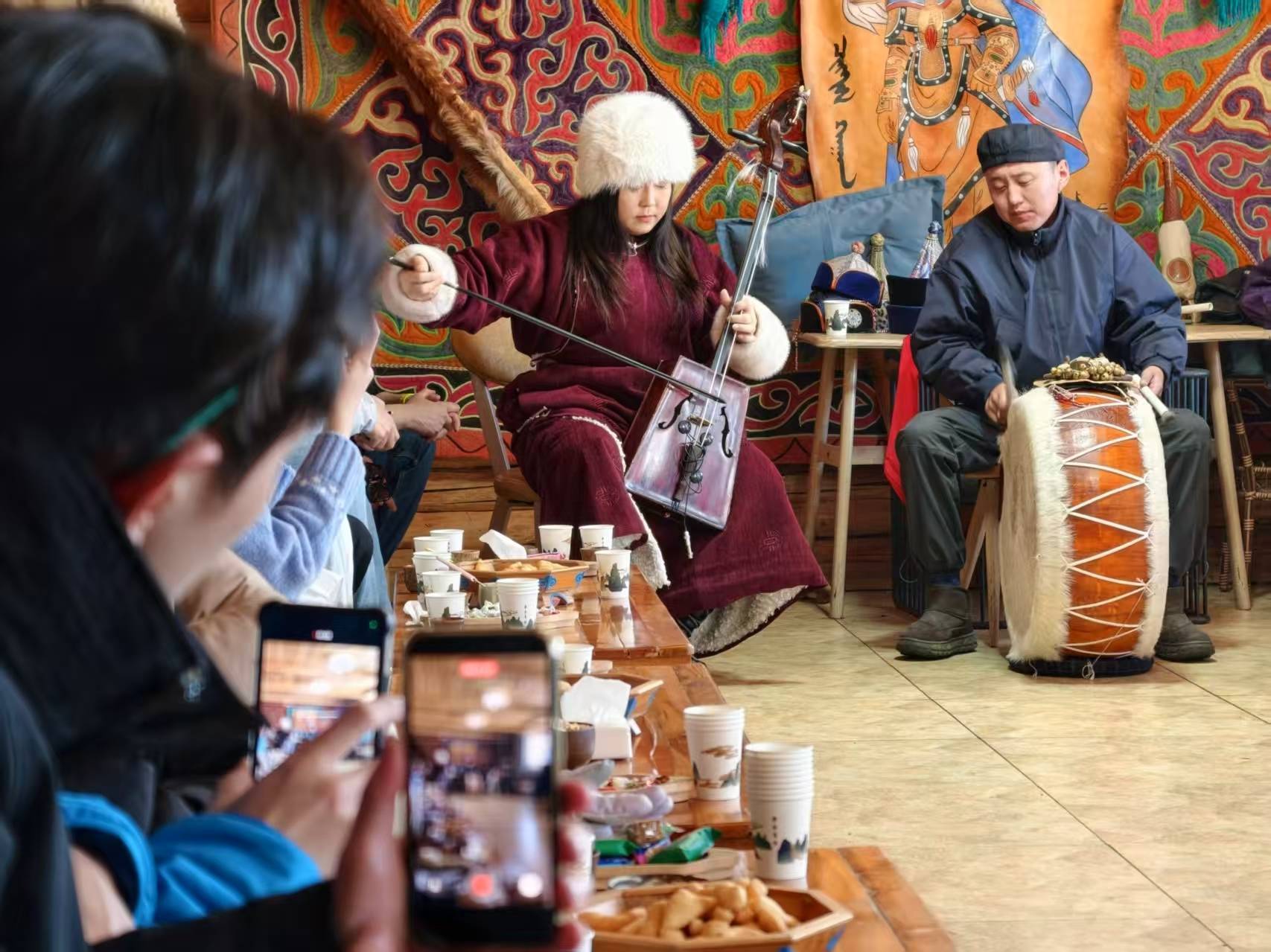 1月30日,台湾青年在新疆喀纳斯景区的木屋欣赏蒙古族图瓦人演奏。新华社记者 贺小童 摄在新疆石河子经济技术开发区的新疆旺旺食品有限公司,青年们触摸发展的强劲脉动,感受台企在新疆扎根生长的蓬勃活力。