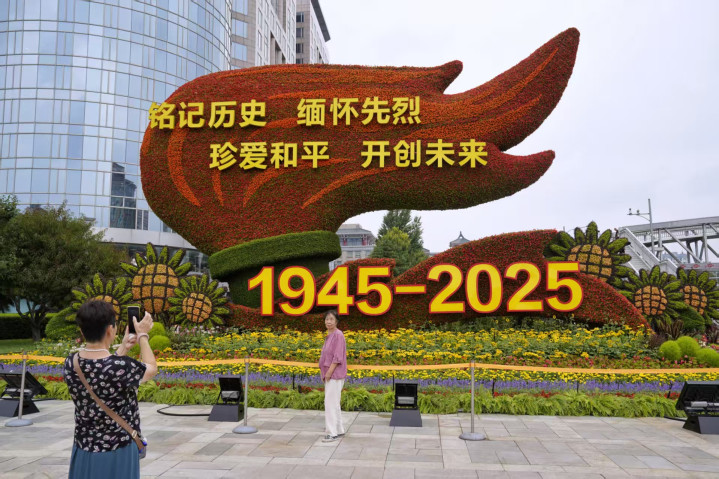 东单西北角——“薪火相传”花坛以火炬为主景,镶嵌“铭记历史、缅怀先烈、珍爱和平、开创未来”文字、“1945-2025”年号,配以红飘带、向日葵等,寓意伟大抗战精神薪火相传、历久弥新。花坛顶高8.5米。