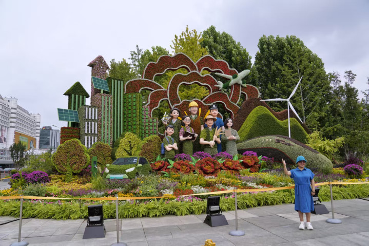 西单西南角——“绿色生活”花坛以蓝绿交织的生态家园为背景,落实“绿化、彩化、立体化”的建设理念,配以休闲、露营、健身等场景,寓意走可持续的绿色发展之路,建设人与自然和谐共生的现代化新图景。花坛顶高8.5米。