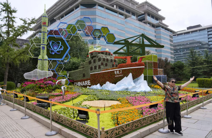 西单东南角——“科技强国”花坛以展示我国在科技领域的创新成果(雪龙2号破冰船、神舟二十号、智能码头、机器人等)为场景,寓意推进高水平科技自立自强,朝着建成科技强国的宏伟目标奋勇前进。花坛顶高8.5米。