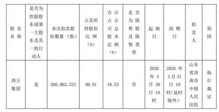 西王食品公告显示,本次拍卖的拍卖人为山东省济南市中级人民法院,因执行裁定,西王集团持有的200,065,333股公司股票(占公司总股本的18.53%),将于2026年3月30日10:00时至31日10:00时止(延时除外)在京东网进行公开拍卖。本次拟拍卖股份数量占西王集团持有公司股份总额的99.01%,该等股份的司法处置存在导致公司实际控制权发生变更的风险。若本次股份拍卖完成,西王集团持有公司2,010,048股,占公司总股本的0.19%,其一致行动人山东永华投资有限公司持有公司14,028,262股,占公司总股本的1.30%,王棣直接持有公司4,104,062股股份,占公司总股本的0.38%。西王集团及其一致行动人合计持有公司股份20,142,372股,占公司总股本的1.87%,将可能导致公司控股股东、实际控制人发生变更。