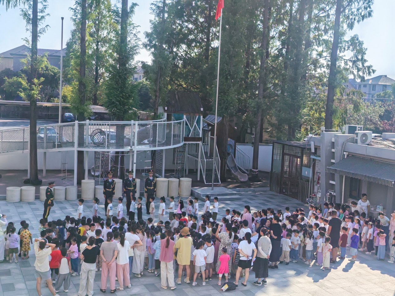 伴随着秋日的朝阳,周浦幼儿园的孩子们身着整齐服装,怀着兴奋与期待,迎来了退役军人国旗仪仗队。仪仗队员们迈着铿锵有力、整齐划一的步伐,护卫着鲜艳的五星红旗步入场地。当庄严的《义勇军进行曲》响起,五星红旗在全体师生深情专注的注目礼中冉冉升起。孩子们用稚嫩而响亮的声音跟唱国歌,清澈的眼神中充满了对国旗的敬畏与对军人的崇敬。这场仪式不仅是一次视觉的震撼,更是一堂生动的爱国主义启蒙课,让孩子们在庄严氛围中初识国家象征与军人风采。