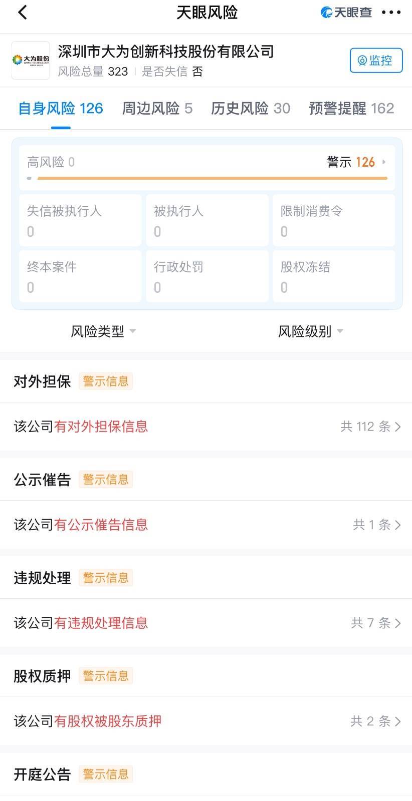 在业绩持续亏损、大额担保频出的情况下,市场对大为股份的风险关注度自然上升。从公开信息看,公司也面临多重风险。