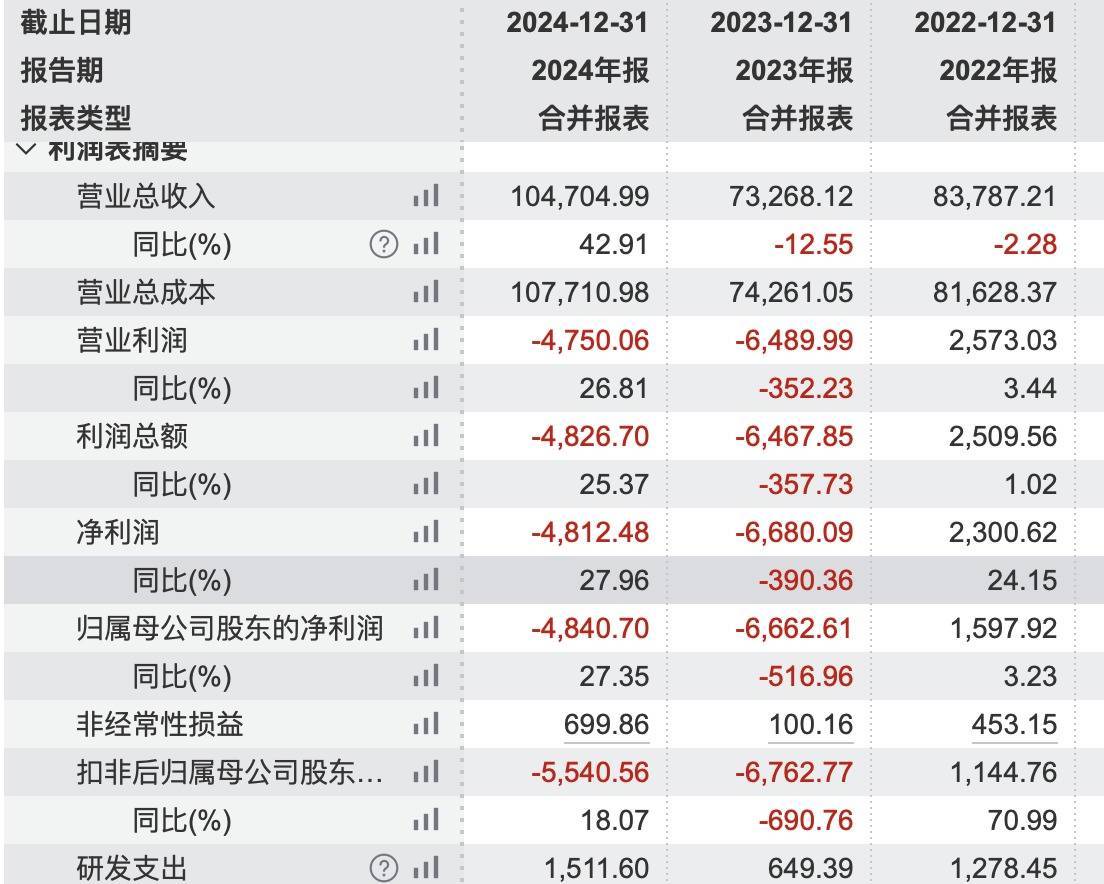 2024年年报显示,公司全年实现营业收入10.47亿元,同比增长42.91%,首次突破十亿元大关。但营收增长的背后是盈利能力的持续疲软。2022年至2024年,公司归母净利润分别为1597.92万元、-6662.61万元和-4840.70万元,已连续两年录得亏损,累计亏损金额超过1.15亿元。