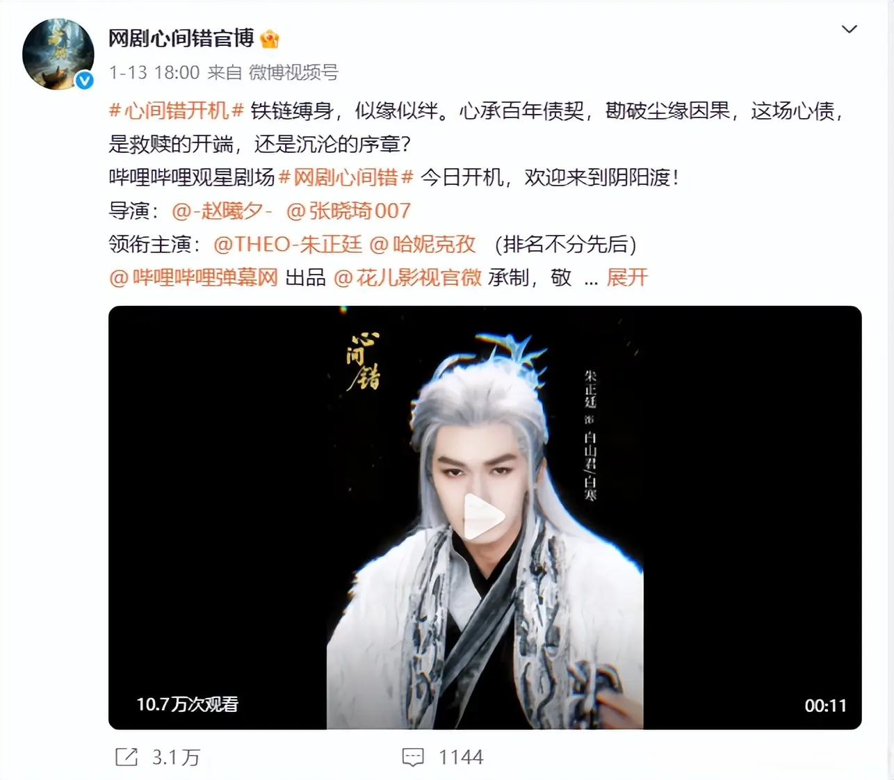 2026年古装志怪赛道藏着不少惊喜,由北京花似火影视申报的《心间错》已于1月13日正式开机,这部24集古装剧仅凭“朱正廷一人双角”“哈妮克孜古装造型”就赚足眼球,有望成为今年的黑马古装剧。#朱正廷#