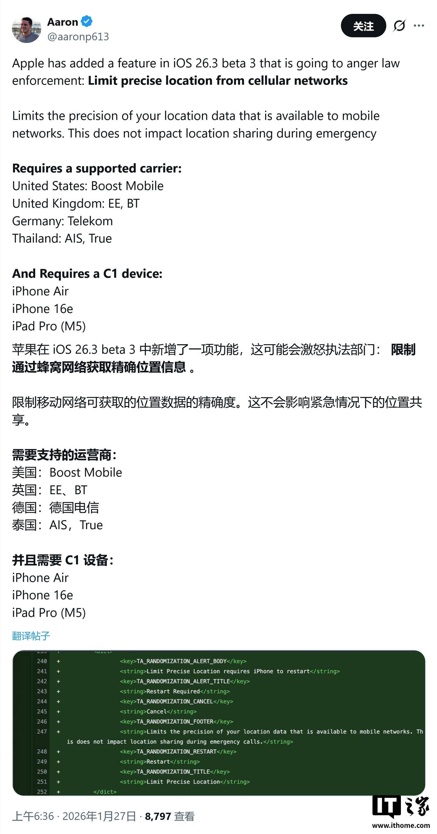 IT之家 1 月 27 日消息炒股配资专业网,苹果公司昨日(1 月 26 日)更新支持文档,详细解读了 iOS 26.3 中新增的“限制蜂窝网络获取的精确位置”功能。