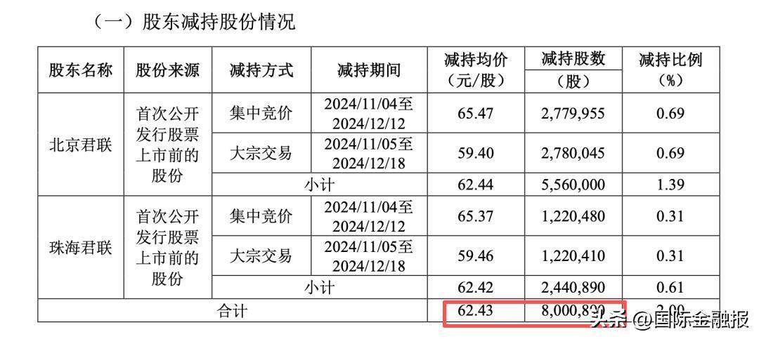 此外,去年5月至6月期间,北京君联还通过询价转让方式以83.1元的平均价格减持833.9万股股份,对应金额约6.9亿元;珠海君联也以83.1元价格减持366.2万股,对应金额超3亿元。