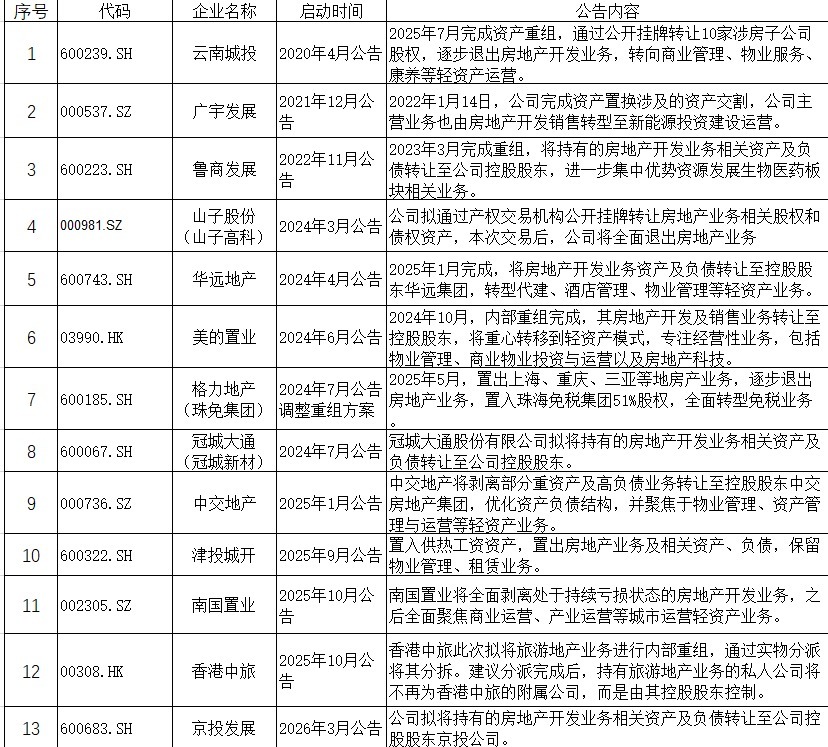 据中指研究院统计,自2020年至今,已有至少13家上市房企剥离房地产业务。