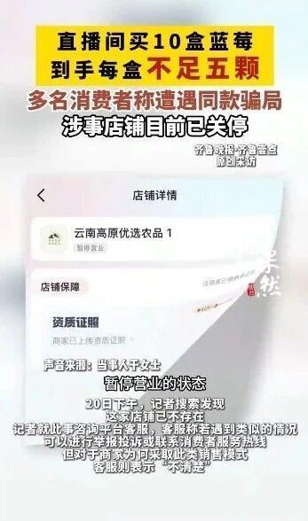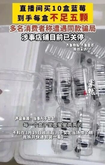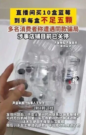 近日,山东消费者于女士遭遇直播带货消费陷阱,花费59.9元购买10盒标称“云南蓝莓”的商品,收货后却发现每盒仅含3至5颗蓝莓,部分包裹甚至出现空盒,商品数量、重量与直播间宣传严重不符。目前,涉事商家因涉嫌虚假宣传、欺诈消费者,已被平台正式关停,该事件引发众多消费者共鸣,也再次揭开直播带货超低价促销背后的乱象。